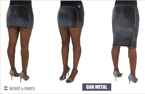 Stretch Velvet fabric is warm, luxurious and rich in color. Mini Skirt has reflective piping on front and back.